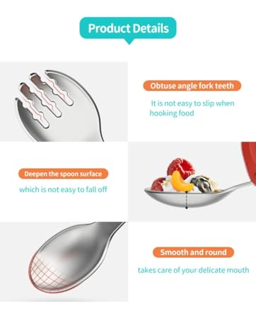 [Carefully designed to care for your baby’s teeth and mouth] Toddler spoons and forks are fabricated from robust and thick chrome steel forks with obtuse angled openings and serrated interiors.