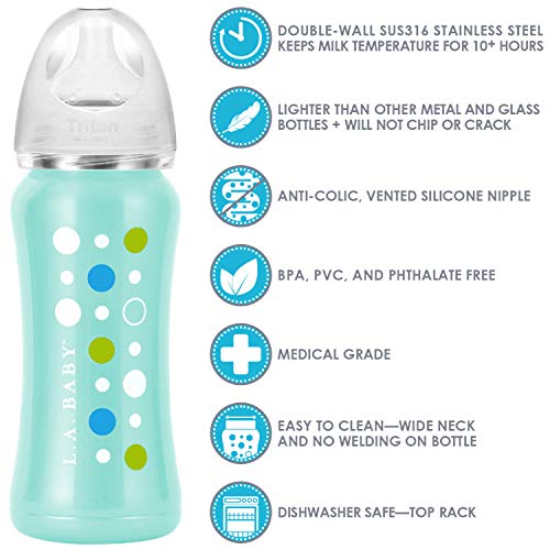 LEAK-FREE, SAFE, GROW-WITH-ME COMPATIBILITY – PHASE 1 | The LA Baby stainless steel baby bottle is extra durable, lightweight, insulating, leak-free and 100% recyclable. Wide-neck opening for HASSLE-FREE CLEANING. Extend the life of your bottle with our compatible sippy cup and toddler straw, handle and carry strap (Sold separately).