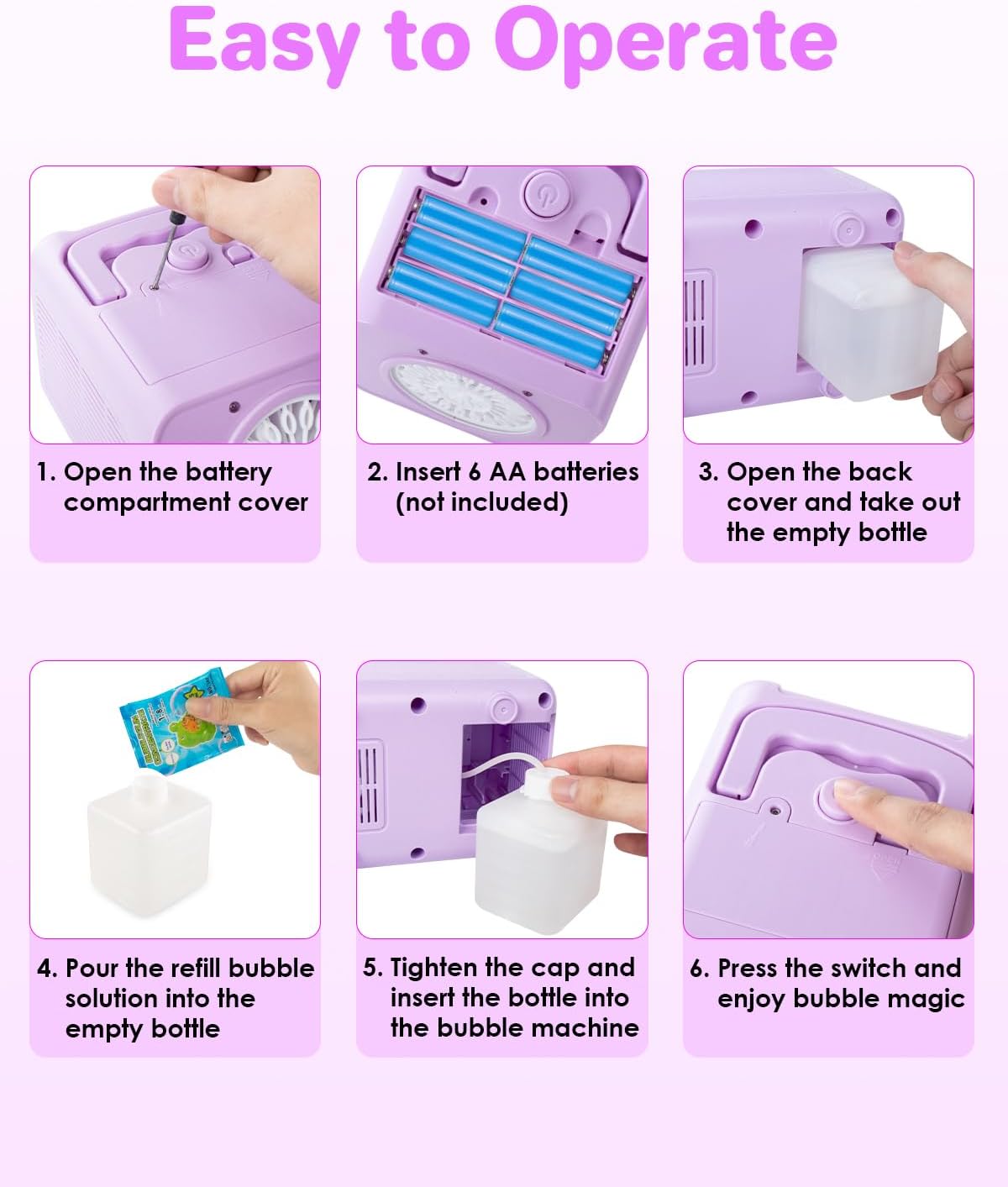 【Security First and Sturdy】: Bubble machine is made from sturdy supplies that may face up to tough use and unintentional bumps whereas retaining youngsters secure. The design is light-weight with no sharp edges and the deal with is simple to grip, making it a secure alternative for teenagers to play. You solely want to put in batteries and bottle of bubble resolution, and the bubble machine can produce countless bubbles, making certain youngsters have countless hours of bubble-blowing enjoyable and glad.
