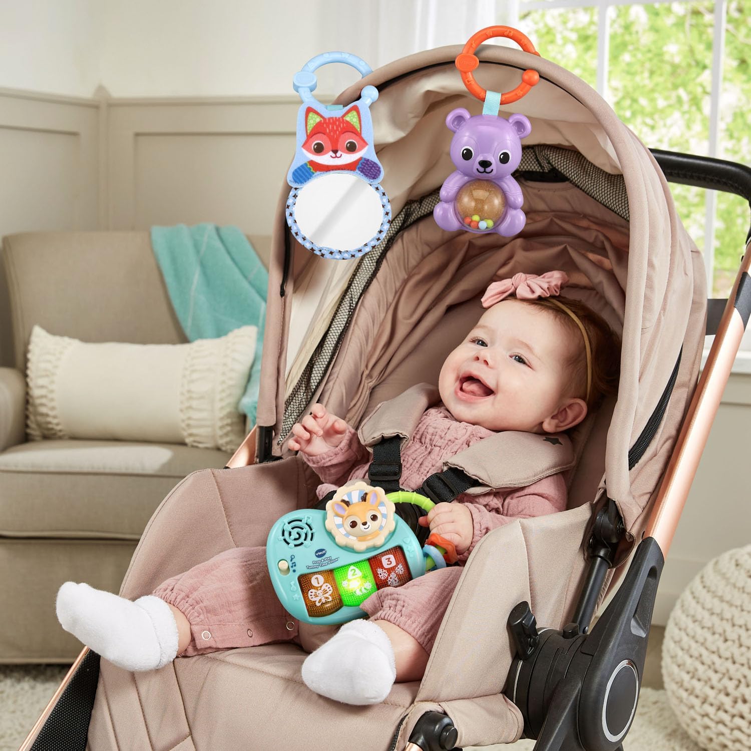 Deliver leisure on the go together with the take-along, removable mirror and rattle; clips to strollers or diaper luggage
