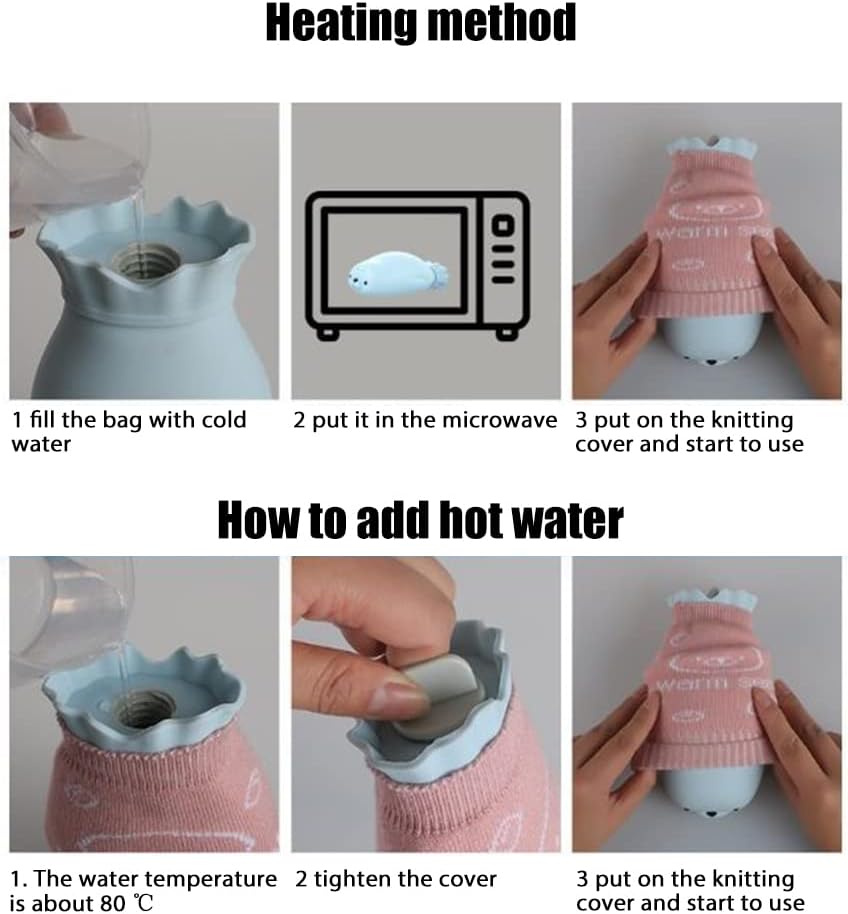 Cold and warm use, appropriate for 4 seasons: Inject heat water or chilly water into the microwave to warmth it, which can be utilized for warm compress or heating Put chilly water within the fridge to be an ice pack, which might be iced or blasted.