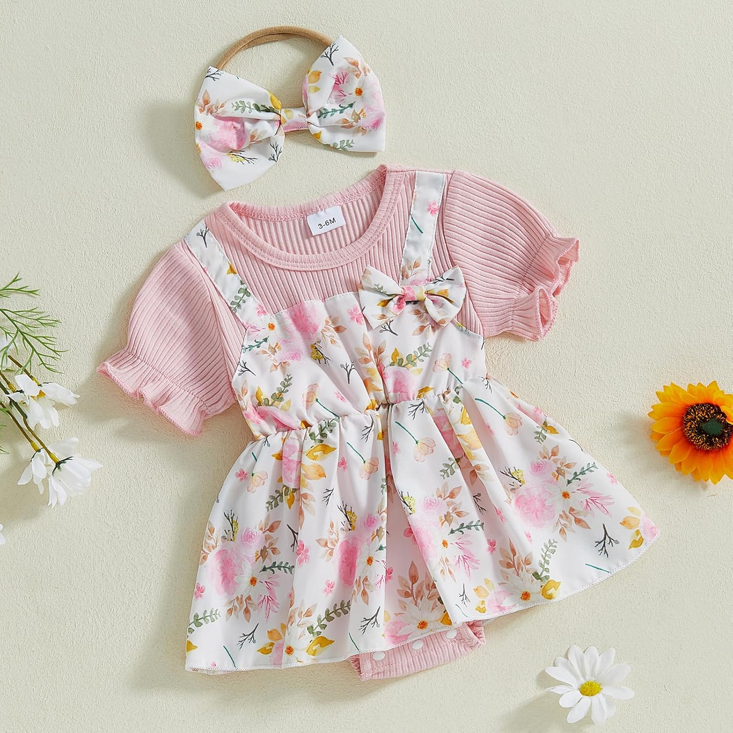 Child Lady Summer season Outfits Brief Sleeve Spherical Neck Patchwork Romper Costume with Headband Set New child Garments