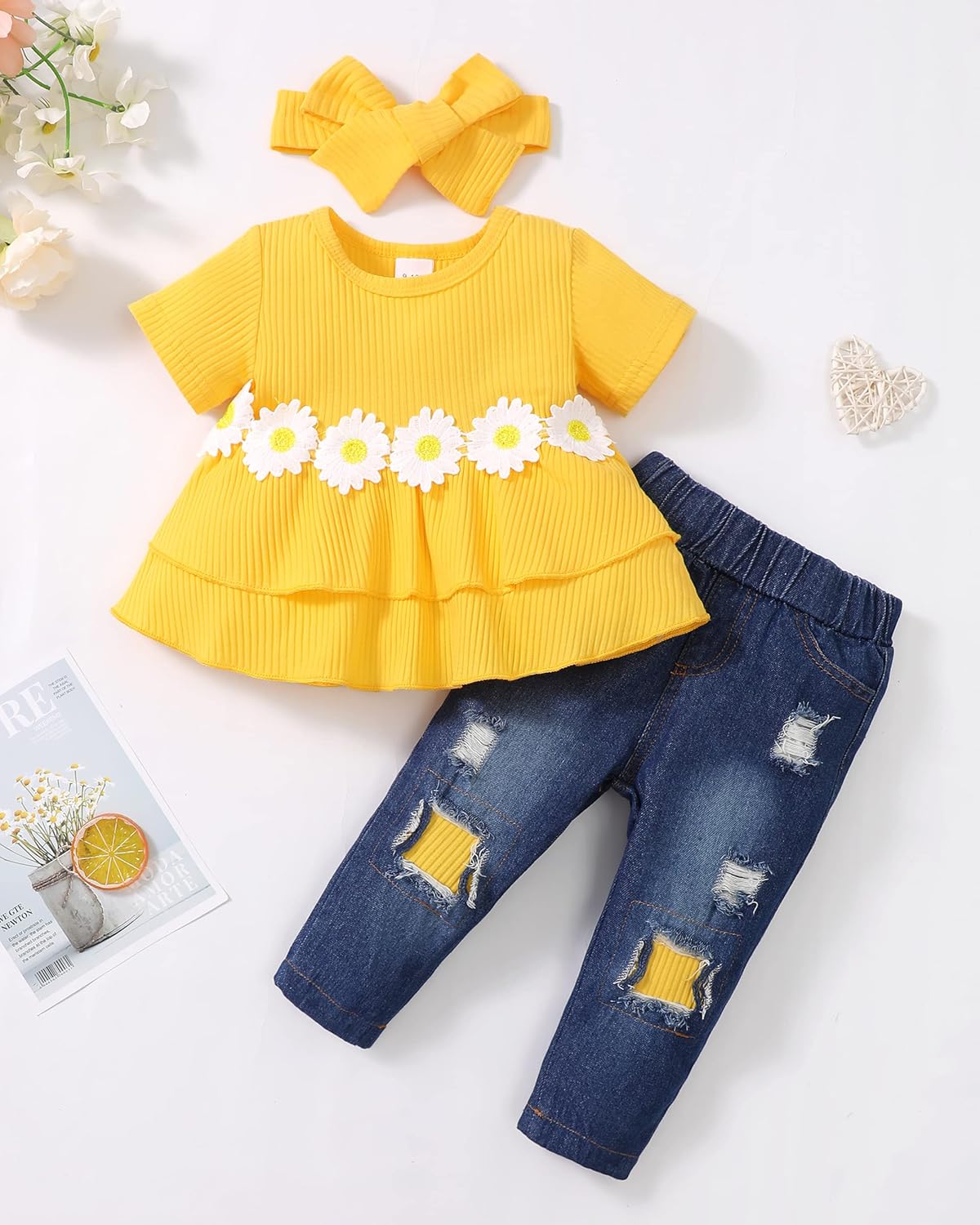 XUANHAO Baby Girl Clothes 12 18 24 Months Outfits For Infant Toddler Denim Girls’ Clothing Ruffle Top Ripped Jeans Pant Sets