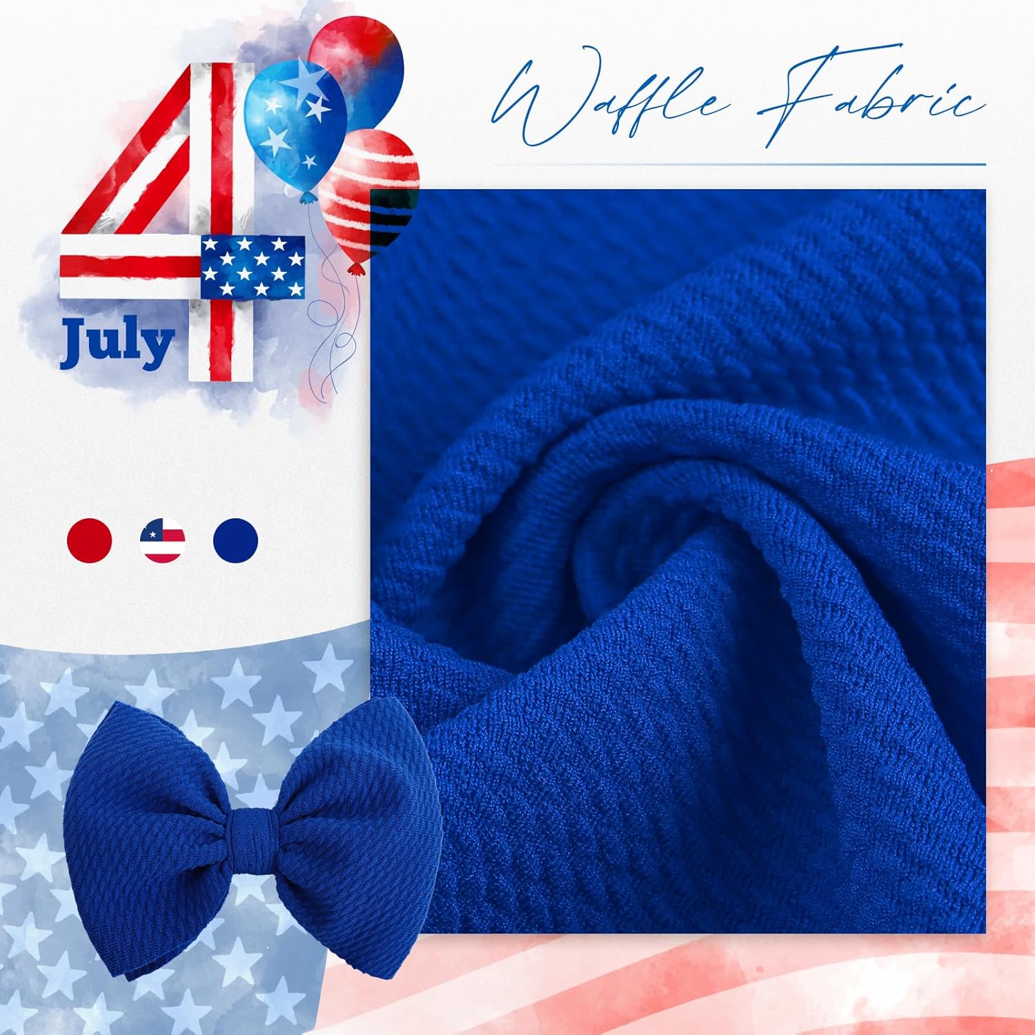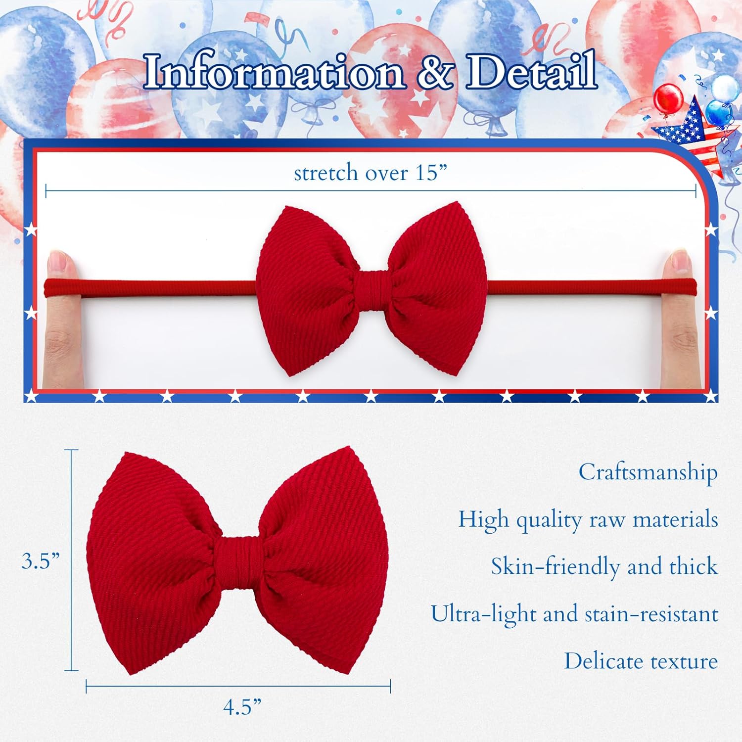 4th of July themed design, boosting environment with basic crimson white and blue!Tremendous gentle stretchy nylon headband, will NOT trigger any discomfort or depart any crimson mark!New child-skin-friendly waffle bow, 100% handmade, no glue!