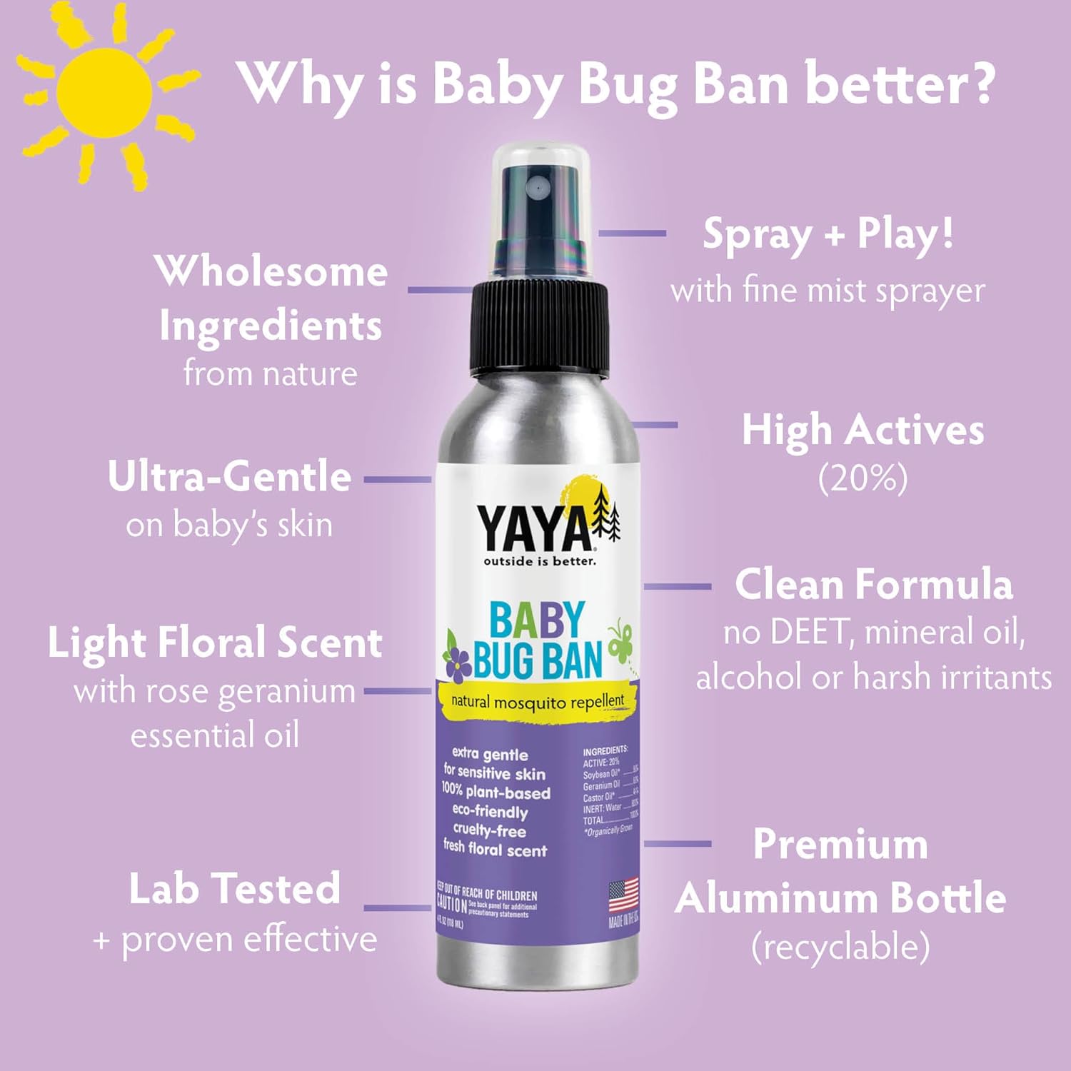 1. YAYA ORGANICS BABY BUG BAN – All-Pure, Confirmed Efficient Repellent for Infants, Kids and Delicate Pores and skin (4 ounce spray): This all-natural and efficient bug spray is specifically designed for infants, youngsters, and people with delicate pores and skin. It’s DEET-free and accommodates important oils which can be confirmed to repel mosquitoes, ticks, and different biting bugs. The handy spray bottle makes it simple to use and carry on-the-go.