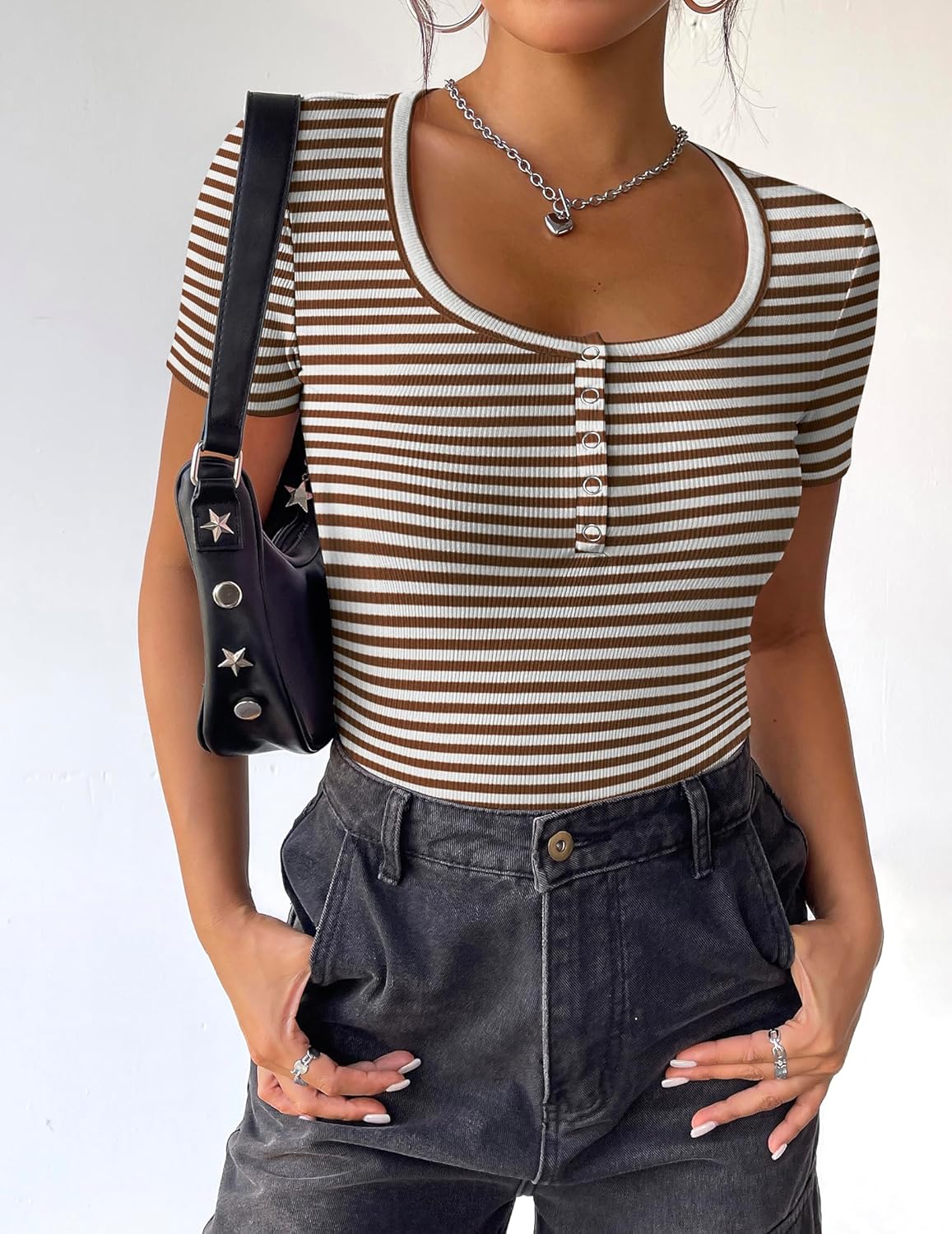 Quick Sleeve Henley Shirts Spring Tops for Women 2025 Short Sleeve Shirts Slim Fit Square Neck Basic Tees Going Out OutfitsSpring Tops for Women 2025 Short Sleeve Shirts Slim Fit Square Neck Basic Tees Going Out Outfits
