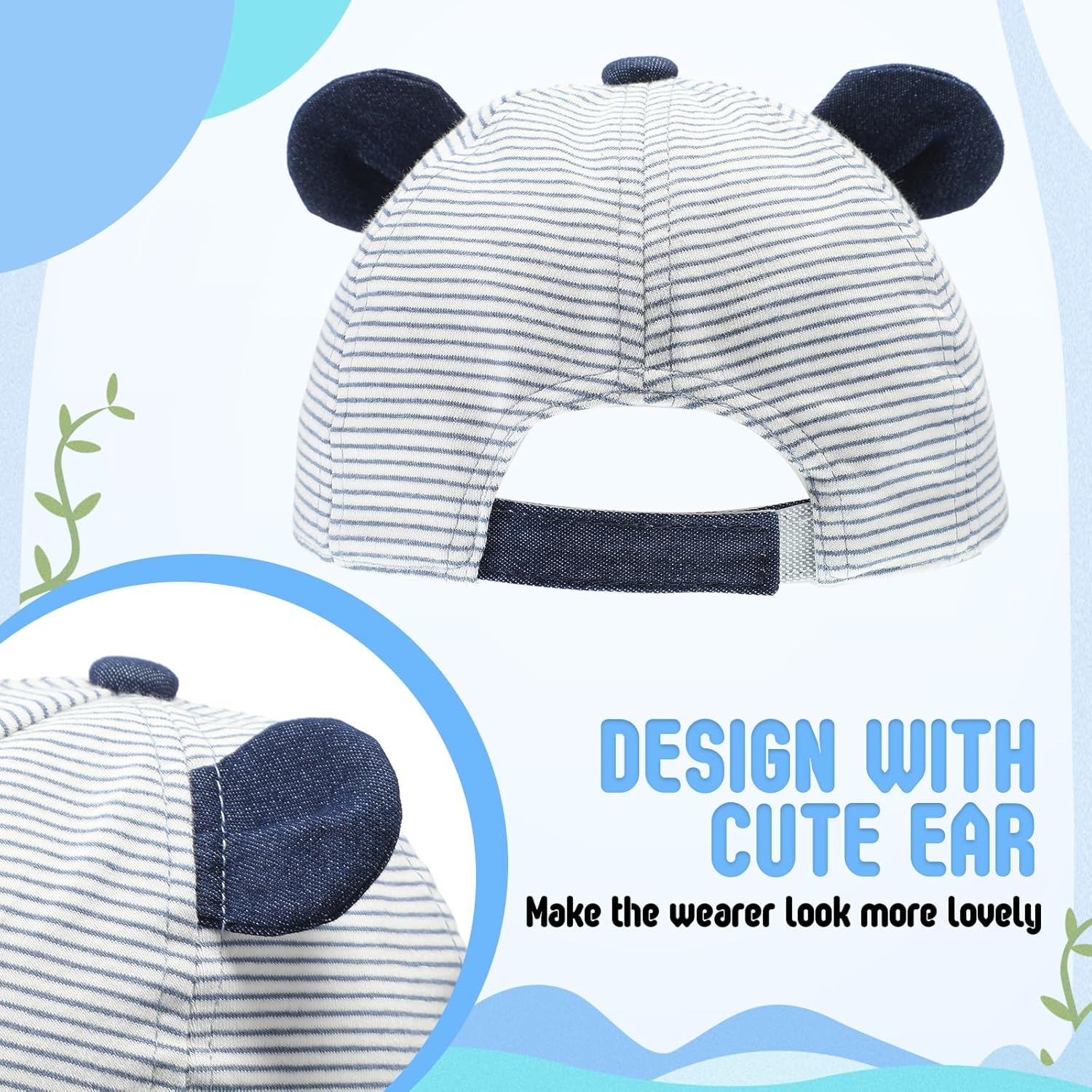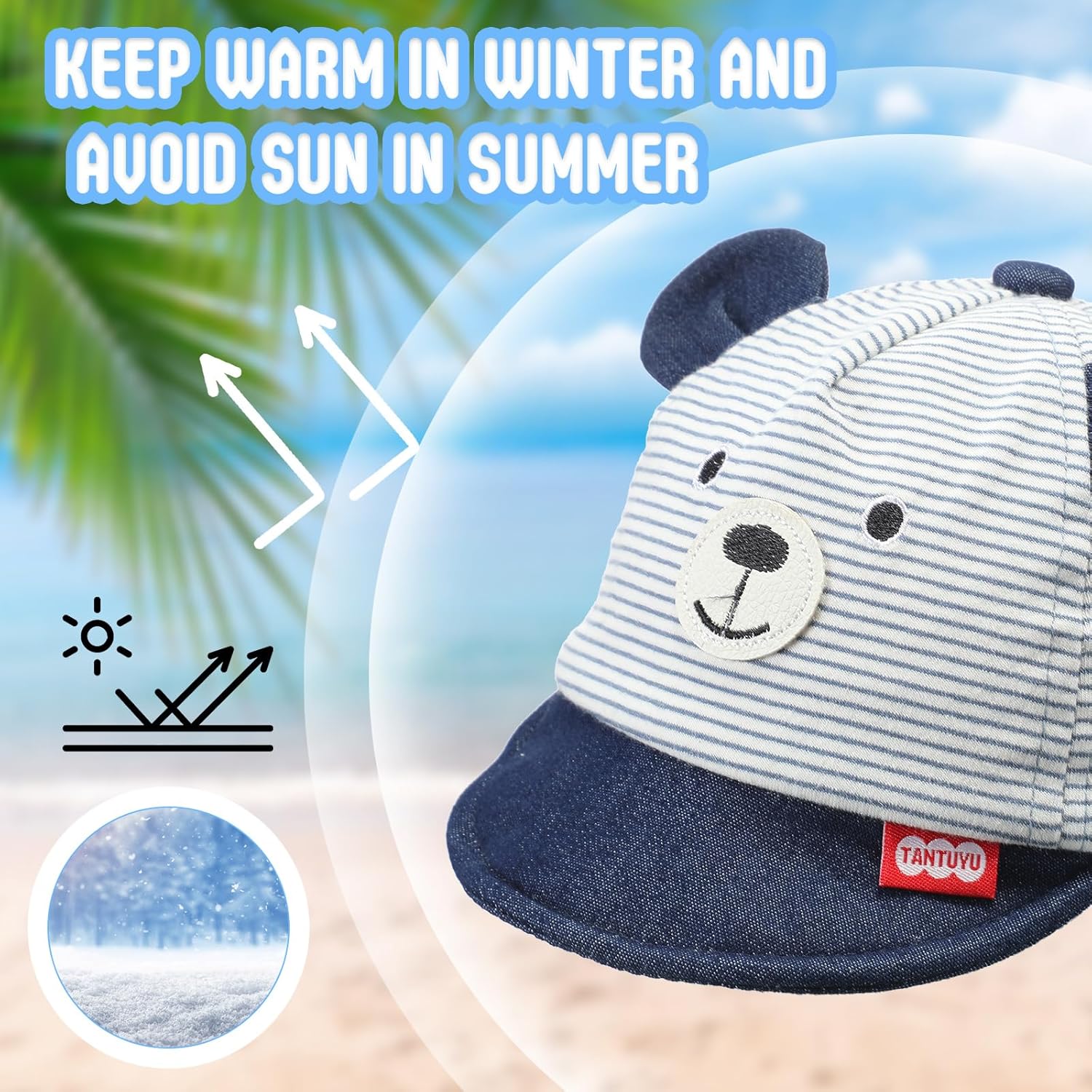 These toddler boy summer season hats have 6 kinds, navy striped bear, grey striped bear, pentagram patterns in purple, black and so forth. They’ll catch infants’ eyes and make them look cute.